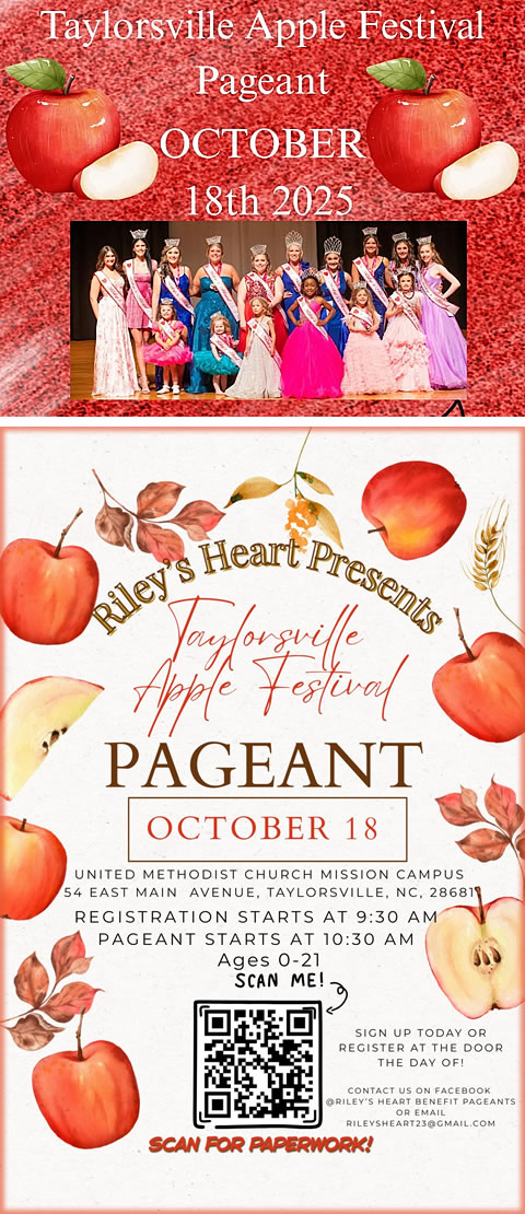 In honor of the Apple in our Apple Festival title, our festival always hosts the apple peeling contest, the apple desert contest, a booth apple theme decorating contest, and of course lots of apple vendors from which to buy cider, a large variety of bagged apples, etc. Apples are very important to Alexander County which currently ranks #3 in North Carolina apple production. But through it all, our Taylorsville Apple Festival is a festival of clean fun for the whole family! And the proceeds raised from the festival go to a good cause. The proceeds raised each year go to all 11 Alexander County Schools for their needy children benevolence funds. So come out and join us and have a great day!