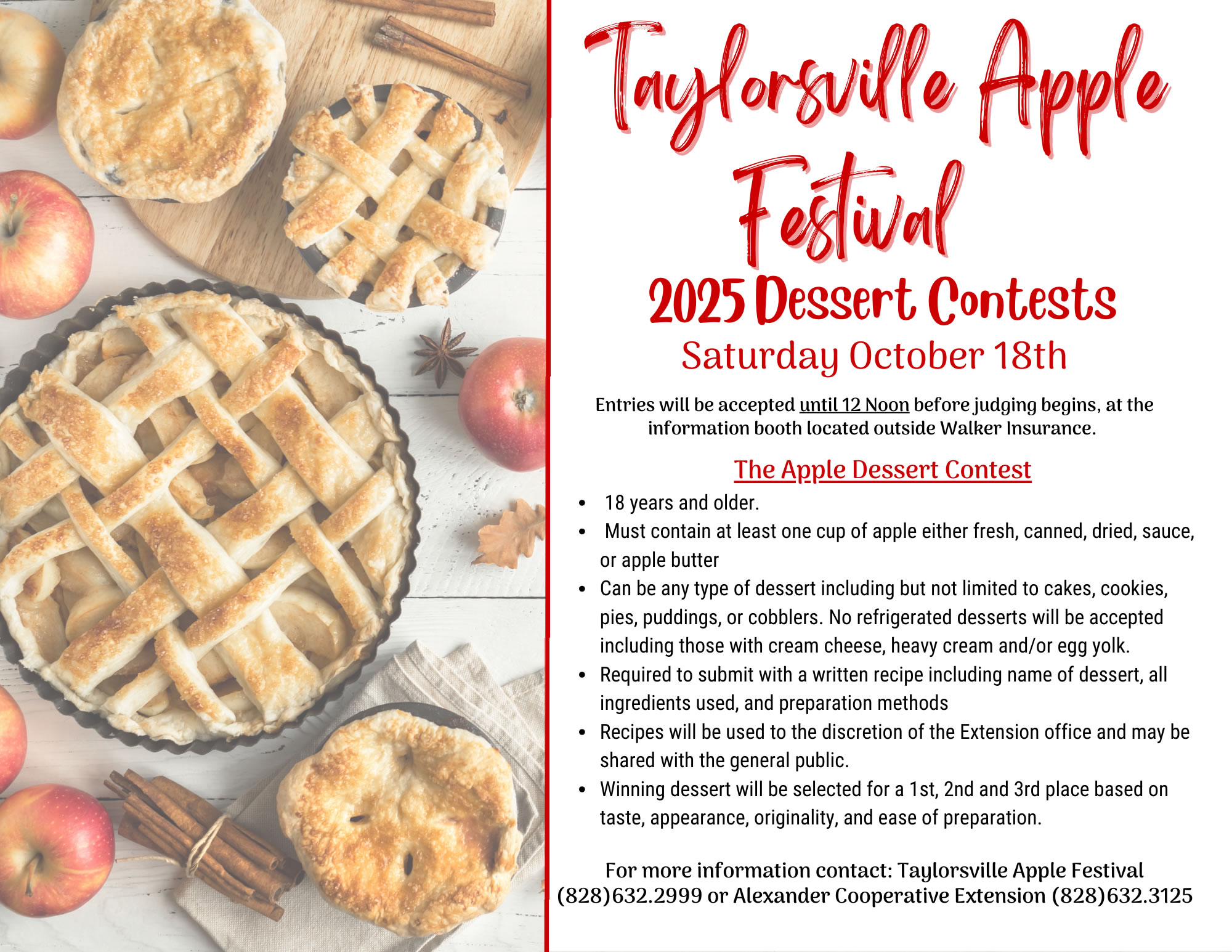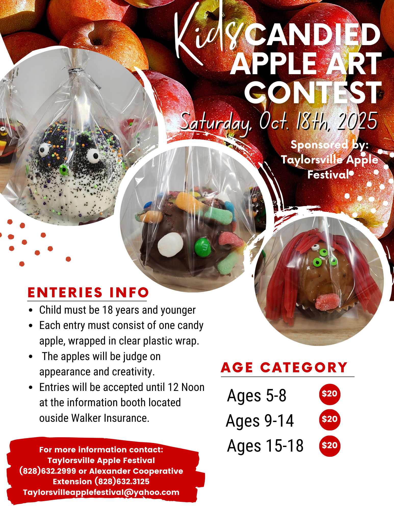 In honor of the Apple in our Apple Festival title, our festival always hosts the apple peeling contest, the apple desert contest, a booth apple theme decorating contest, and of course lots of apple vendors from which to buy cider, a large variety of bagged apples, etc. Apples are very important to Alexander County which currently ranks #3 in North Carolina apple production. But through it all, our Taylorsville Apple Festival is a festival of clean fun for the whole family! And the proceeds raised from the festival go to a good cause. The proceeds raised each year go to all 11 Alexander County Schools for their needy children benevolence funds. So come out and join us and have a great day!
